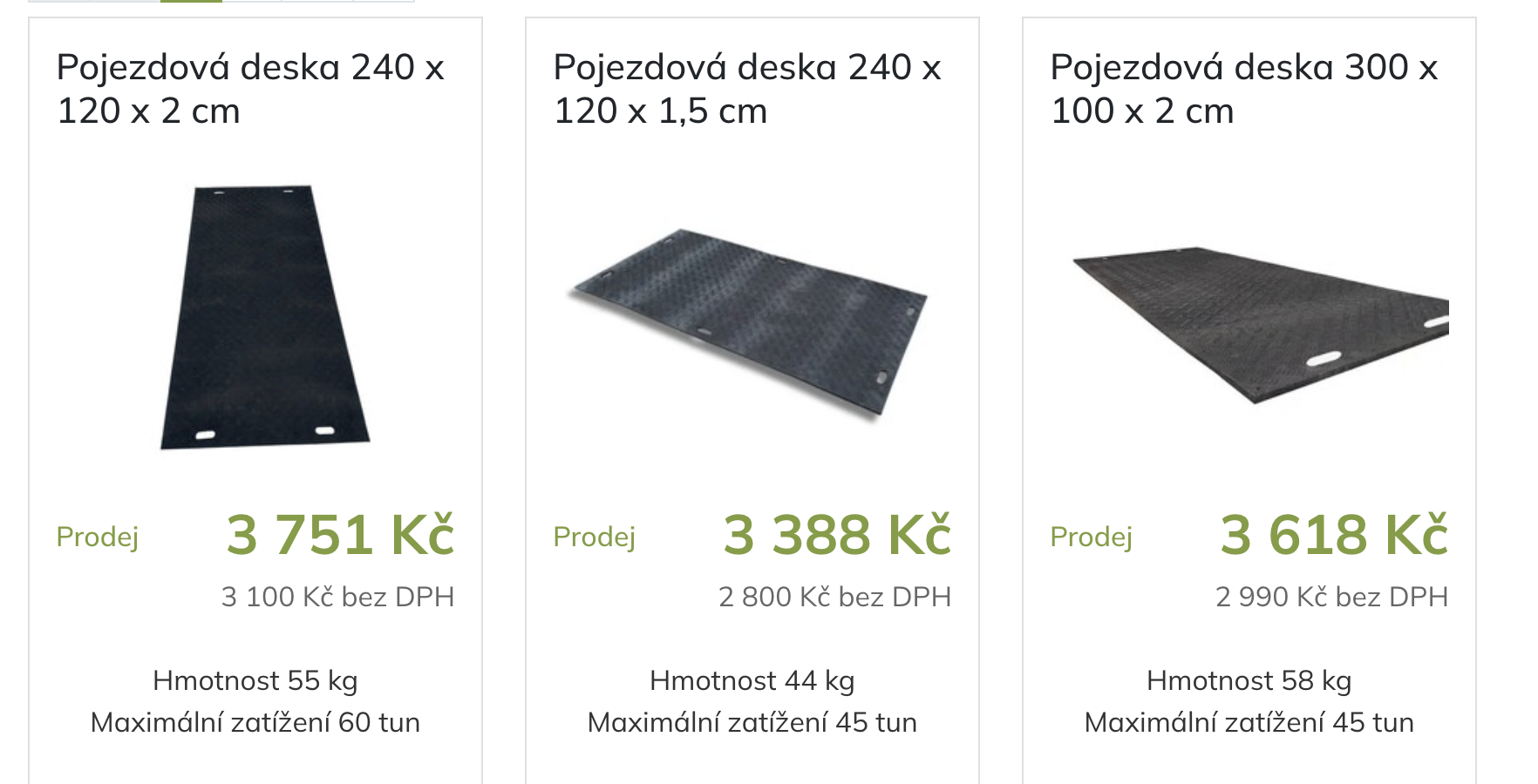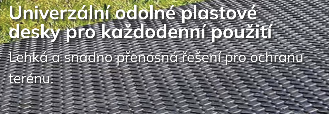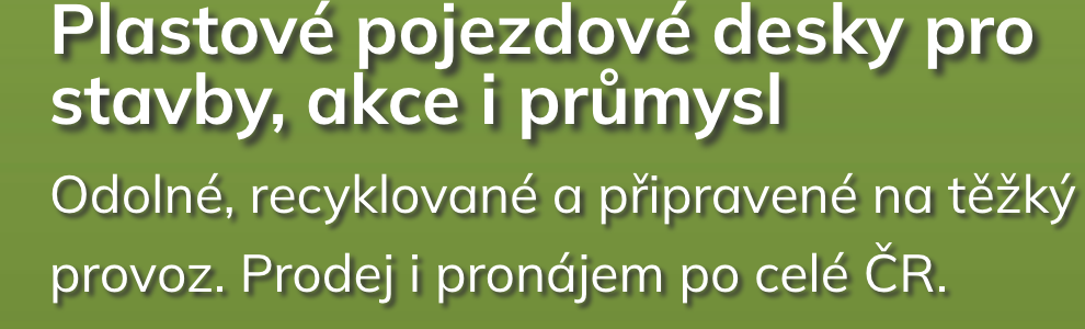 Plastové pojezdové desky z HDPE pro vytvoření dočasné komunikace v terénu. Chrání trávník, půdu i finální povrchy, snadná pokládka, vysoká nosnost až 120 tun.